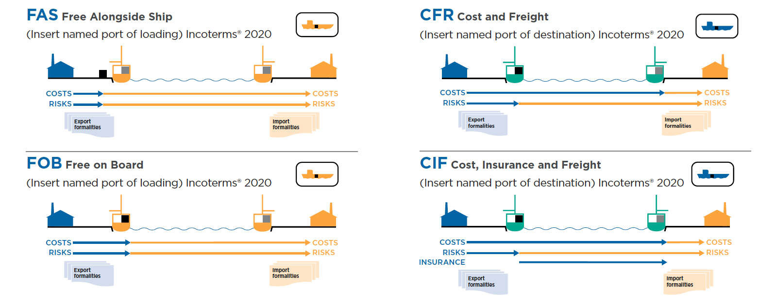 - FAS (Free Alongside Ship): FAS terms stipulate that the seller delivers the goods alongside the vessel at the named port of shipment. The seller assumes responsibility and costs until the goods are placed alongside the ship, cleared for export. Once the goods are delivered alongside the vessel, the risk transfers to the buyer.